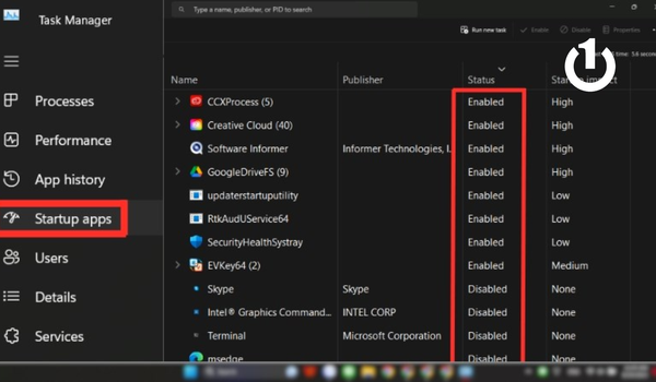 Bước 2: Chọn vào tab Startup > Click chuột phải vào những ứng dụng bạn muốn tắt khởi động cùng máy tính và chọn Disable.