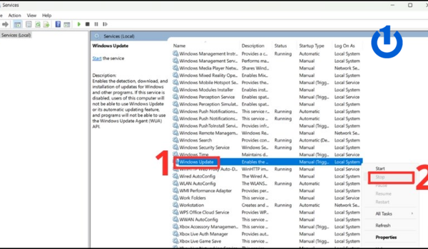 Bước 2: Bạn tìm và click chuột phải vào thư mục Windows Update sau đó chọn Stop để tắt hoàn toàn.