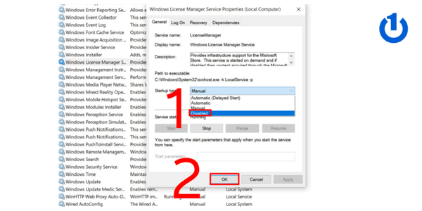 Click chuột liên tiếp 2 lần “Windows License Manager Services” Bước 3: Sẽ xuất hiện cửa sổ thông báo, tại mục “Startup type” → chọn mục “Disabled” chọn OK để hoàn tất vô hiệu hóa.
