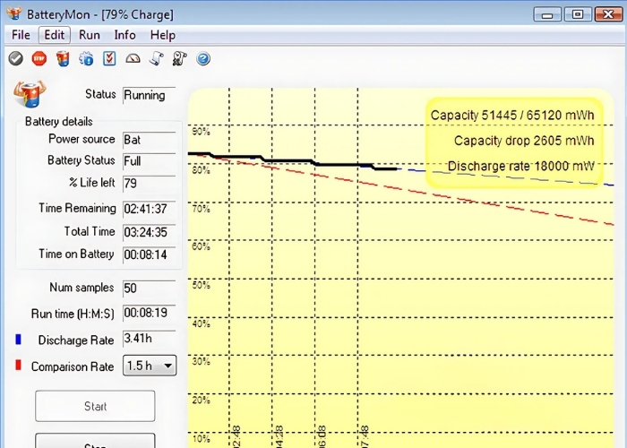 Tại đây, phần mềm sẽ cung cấp chi tiết thông tin về dung lượng pin, tốc độ sạc, thời gian sử dụng còn lại,... Ngoài ra, Batterymon còn có thể tạo ra biểu đồ hiển thị hiệu suất pin theo thời gian khá chi tiết.