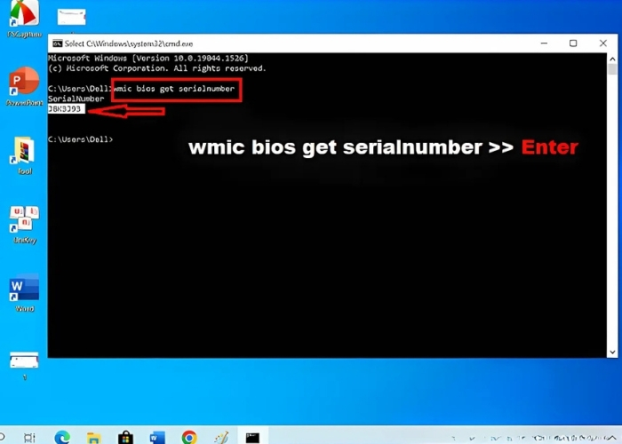 Bước 2: Gõ lệnh kiểm tra pin laptop “wmic bios get serialnumber” rồi nhấn “Enter” và số serial của máy sẽ hiển thị.