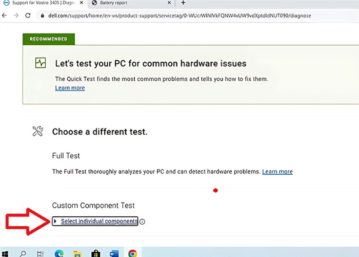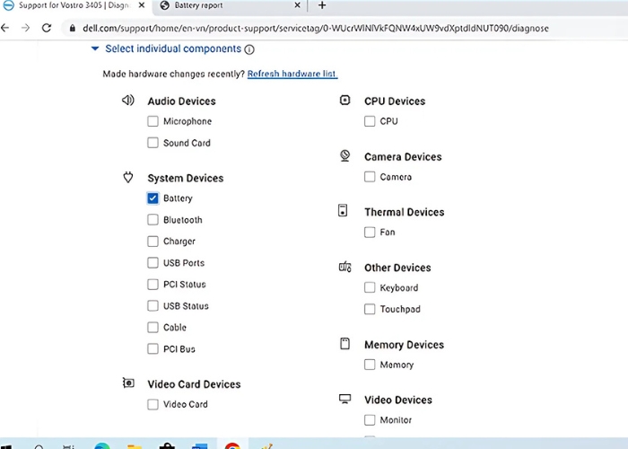 Bước 6: Chọn linh kiện cần kiểm tra và ở bài viết này đang đề cập đến pin laptop Dell nên hãy chọn “Battery”.