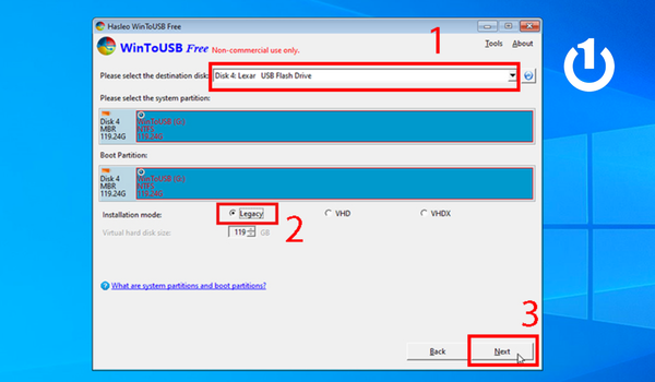 Bước 4: Chọn ổ của USB tại “Please select the destination disk” → Tại mục “Installation Mode” chọn “Legacy” →Nhấn “Next” và chờ một lúc để hoàn thành quá trình cài đặt.