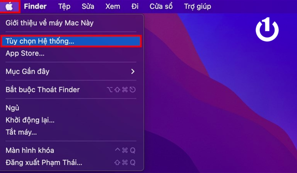 Bước 1: Trên máy Macbook chọn menu Apple có biểu tượng quả táo ở góc trên bên trái màn hình → Sau đó chọn mục Tùy chọn Hệ thống.