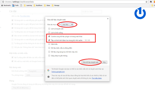 Bước 3: Chọn thời gian, các loại dữ liệu (history, cookies, cache) bạn muốn xóa.