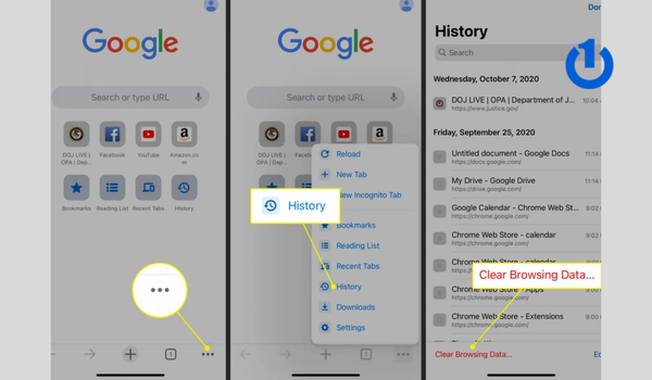 Bước 1: Click vào dấu 3 chấm trên thanh menu → Chọn “Library” → Tiếp tục chọn vào “History” → Và chọn “Clear Recent History”.