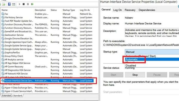 Tìm Human Interface Device Service và đảm bảo trạng thái được đặt ở chế độ Automatic