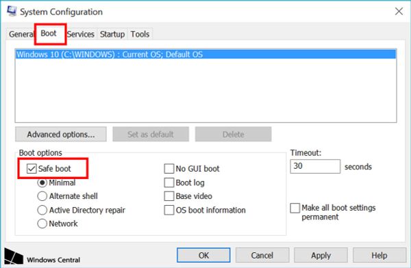 Trong cửa sổ System Configuration, chọn tab Boot, tích vào tùy chọn Safe Boot