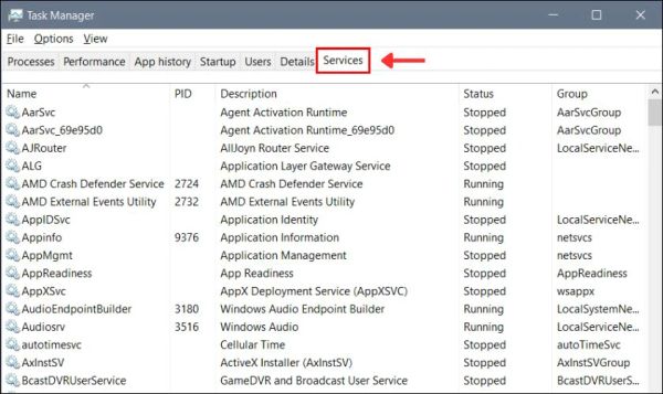 Mở Task Manager, chuyển sang tab Services