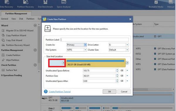 - Bước 1: Mở phần mềm và chọn ổ cứng bị bad sector. Tìm các vùng bad sector trên ổ cứng và xác định điểm bad sector cần cắt dung lượng để không sử dụng đến chỗ đó. Sau đó, nhấp vào nút OK để tiếp tục.