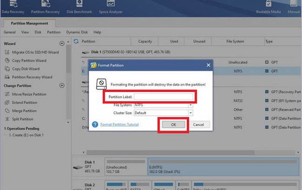 - Bước 3: Đặt tên cho phân vùng mới được tạo và bấm vào OK.
