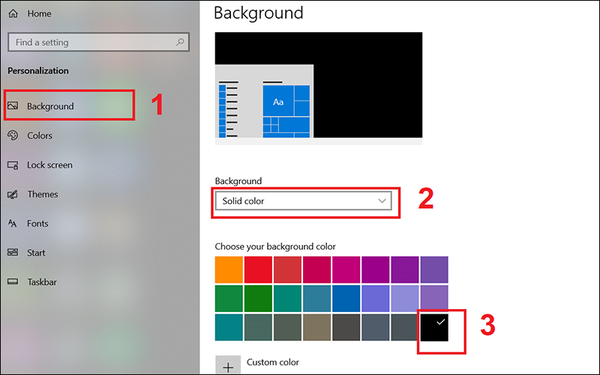 - Bước 3: Trong hộp thoại Personalize, chọn "Background" (Hình nền) ở phía bên trái. Tại phần Background bên phải, nhấp vào mũi tên xuống và chọn "Solid Color" (Màu đơn sắc). Sau đó, chọn một màu sắc để hiển thị trên màn hình desktop.