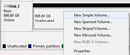 Bước 6: Nhấp chuột phải vào ổ đĩa và chọn New Simple volume => OK.