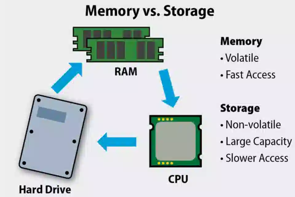 Trong khi đó, ổ cứng là thiết bị dùng để lưu trữ dữ liệu lâu dài trên máy tính. Ổ cứng có dung lượng lớn hơn RAM và được sử dụng để lưu trữ các tập tin và chương trình cho máy tính. Tuy nhiên, tốc độ truy cập dữ liệu trên ổ cứng thường chậm hơn so với RAM, do đó RAM vẫn là yếu tố quan trọng để cải thiện hiệu suất và tốc độ của máy tính.