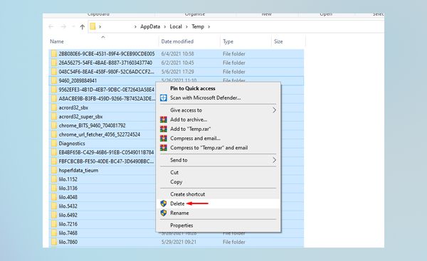 Bước 2: Sau khi ở màn hình desktop xuất hiện các thư mục file tạm thời, bạn nhấn tổ hợp phím “Ctrl + A”-> nhấn “delete”.