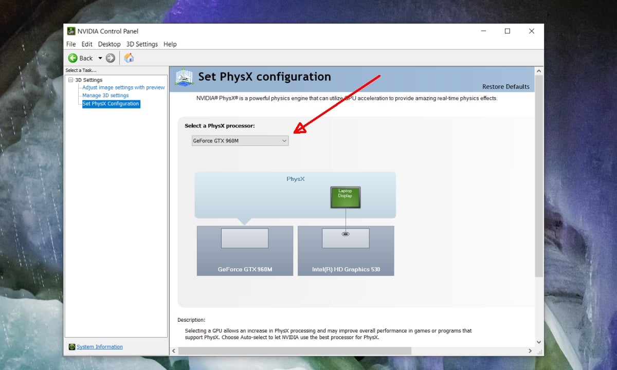 Bước 2: Chọn thiết bị sử dụng cho PhysX từ menu xổ xuống, ví dụ "GPU" hoặc "CPU".