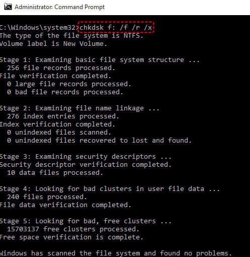 Trong đó, "f:" là ký tự ổ đĩa bạn cần kiểm tra. Thêm "/f" để sửa lỗi tìm thấy trong phân vùng/bộ đĩa F và "/r" để xác định các phần xấu trên ổ đĩa và khôi phục dữ liệu có thể đọc. Tuy nhiên, một số dữ liệu không thể khôi phục bằng "/r", vì vậy bạn cần phát triển thói quen sao lưu dữ liệu thường xuyên. Ngoài ra, thêm "/x" để buộc bỏ gắn ổ đĩa trước khi bắt đầu quá trình này.
