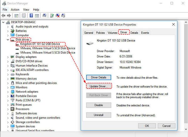 Để truy cập Device Manager, bạn có thể click vào Start và gõ "devmgmt.msc" hoặc tới Control Panel và click vào Device Manager. Sau đó, tìm đến ổ đĩa bị ảnh hưởng trong danh sách Disk driver, click chuột phải và chọn Properties > tab Driver > Update Driver.