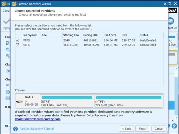 - Bước 4: Chọn tất cả các phân vùng cần thiết, bao gồm phân vùng hiện có và phân vùng bị xóa / bị mất. Sau đó, nhấp vào nút Finish để quay lại giao diện chính của MiniTool Partition Wizard.