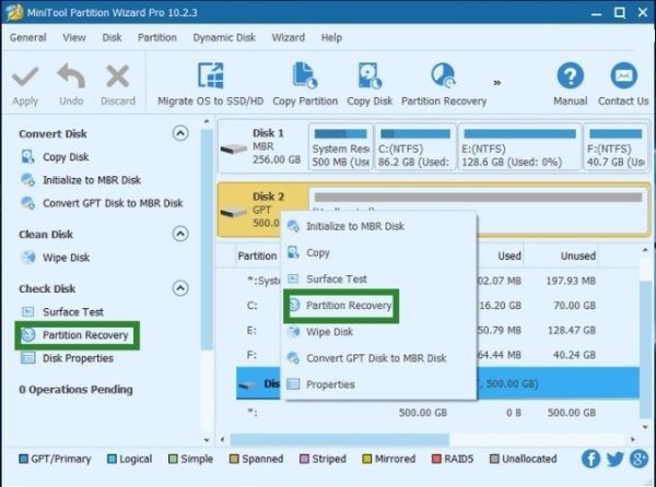 - Bước 2: Chọn ổ đĩa mà bạn muốn khôi phục phân vùng và nhấp vào tính năng Partition Recovery từ bảng điều khiển bên trái hoặc từ menu context (menu hiện ra khi bạn click phải chuột vào các đối tượng).
