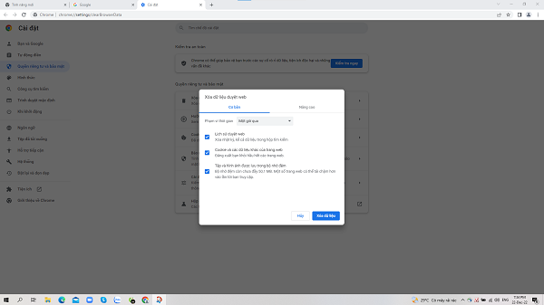 Bước 2: Sau khi xuất hiện các tùy chọn thì bạn sẽ tick chọn các mục mà bạn muốn xóa. Nếu chỉ muốn xóa lịch sử duyệt web thì bỏ chọn hai mục còn lại của bảng tùy chọn.