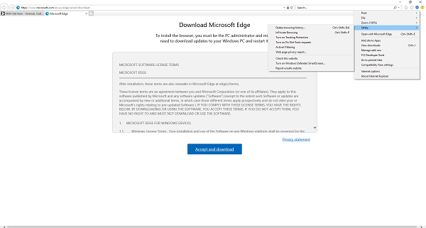 Cách 1: Bạn vào trình duyệt Internet Explorer, sau đó chọn công cụ cài đặt được đặt ở góc phải trên cùng của màn hình. Khi menu hướng tới tùy chọn “An toàn” thì bạn mở ra và chọn xóa lịch sử duyệt web.