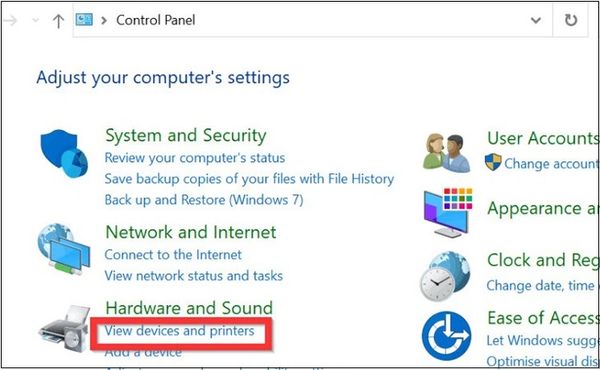 Bước 1: Mở Control Panel > Chọn View Devices and Printers (hoặc vào Menu Start > Devices and Printers).