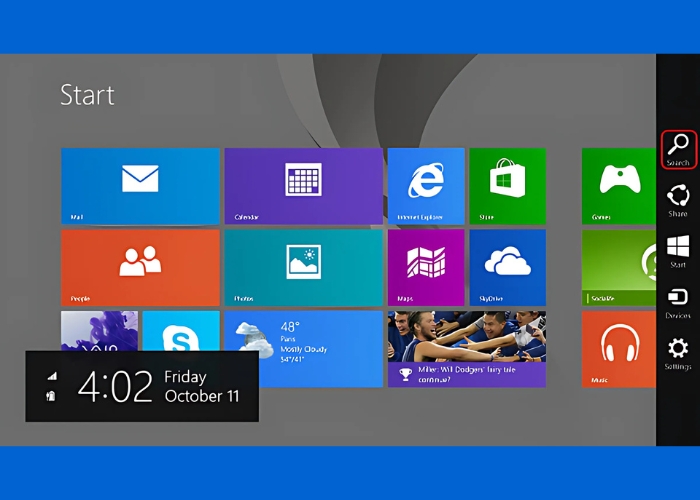 Bước 1: Di chuyển chuột tới góc phải dưới hoặc góc phải trên của màn hình (không nhấp chuột) để chọn “Search”. Hoặc bạn có thể sử dụng tổ hợp phím “Windows Logo + W” sẽ đưa bạn đến màn hình “Search”.