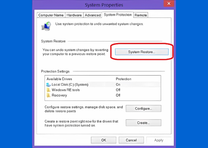 Bước 3: Ở tab “System Properties”, hãy nhấn nút “System Restore”.