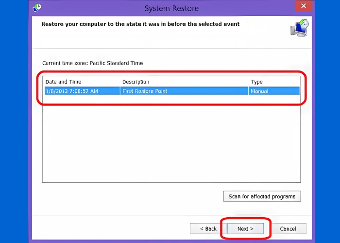 Bước 5: Ở tab “Restore your computer to the state it was in before the selected event”, hãy nhấn chọn “Restore Point” mong muốn rồi nhấn “Next”.