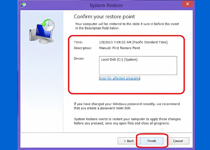 Bước 6: Ở màn hình “Confirm your restore point”, hãy nhấn nút “Finish”.
