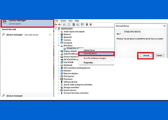 Bước 2: Nhấp chuột vào “Disk drives” và chọn driver đang dùng, chọn tiếp “Uninstall” để xoá.