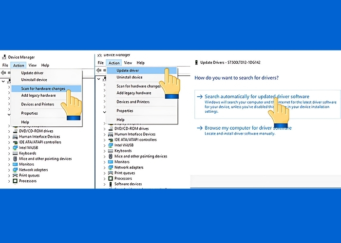 Bước 4: Nếu vẫn chưa khắc phục được lỗi, bạn có thể thao tác lại bước trên bằng cách chọn “Action” và “Scan for hardware changes/Tìm kiếm phần cứng bị thay đổi” hoặc chọn “Action” và chọn “Update driver”.