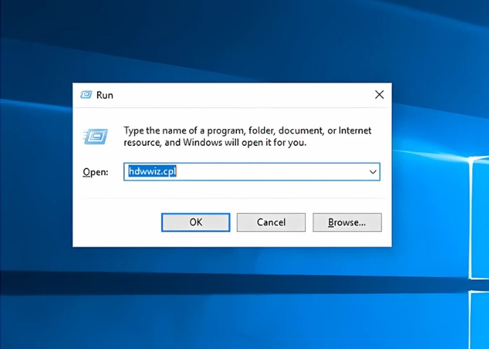 Bước 1: Nhấn tổ hợp phím “Windows +R” để mở ra hộp thoại “Run” rồi nhập lệnh “hdwwiz.cpl” rồi nhấn “Enter”.