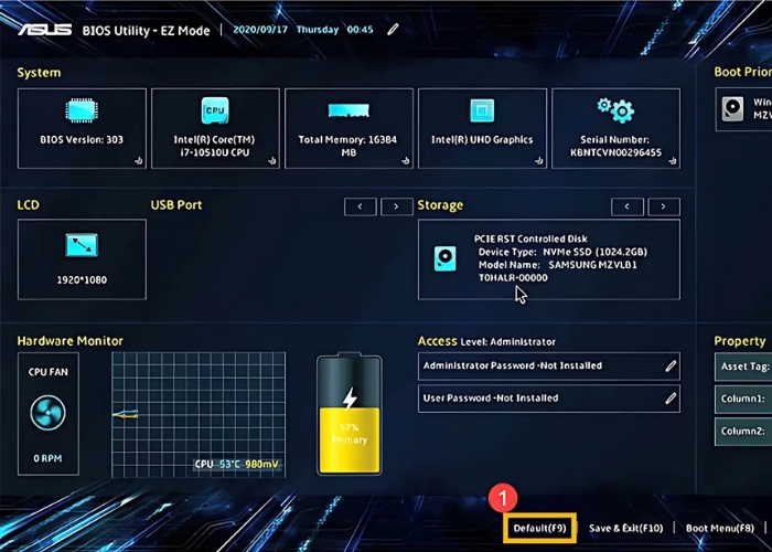 Bước 1: Vào cấu hình BIOS của laptop Asus rồi nhấn phím “F9”.