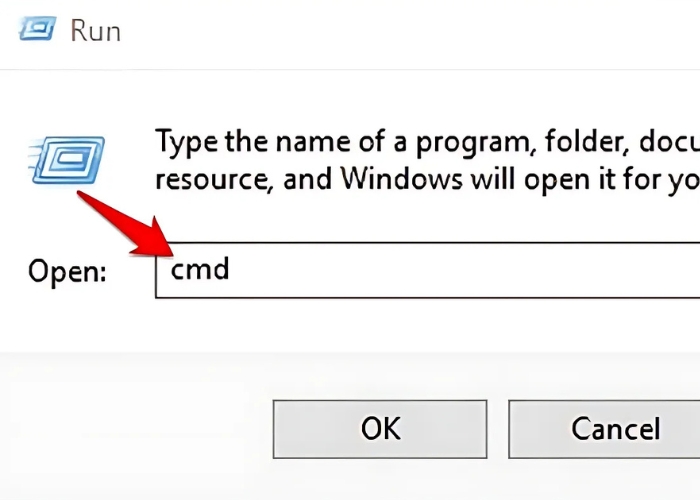 Bước 1: Nhấn tổ hợp phím “Windows + R” để mở hộp thoại “Run” rồi nhập lệnh “cmd” và nhấn “Enter”.