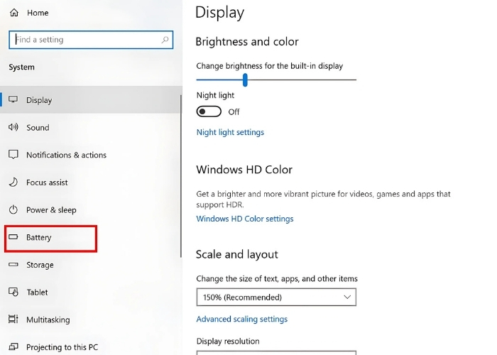 Bước 2: Chọn tiếp “System” => “Battery” và ở mục “Battery Saver” hãy chọn bỏ ô “Turn battery saver on automatically if my battery falls below”.