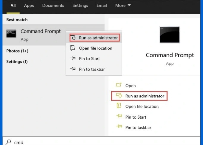 Bước 1: Tại ô tìm kiếm trên thanh taskbar, nhập “cmd”, nhấn chuột phải vào “Command Prompt” rồi chọn “Run as administrator”.