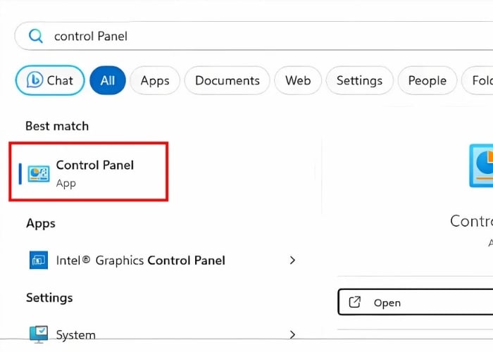 Bước 1: Mở “Control Panel” ở thanh công cụ tìm kiếm.