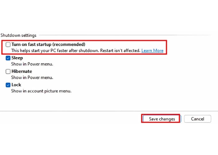Bước 5: Nếu mục “Turn on Fast Startup” bật, hãy bỏ tick và chọn “Save Changes” để lưu lại.