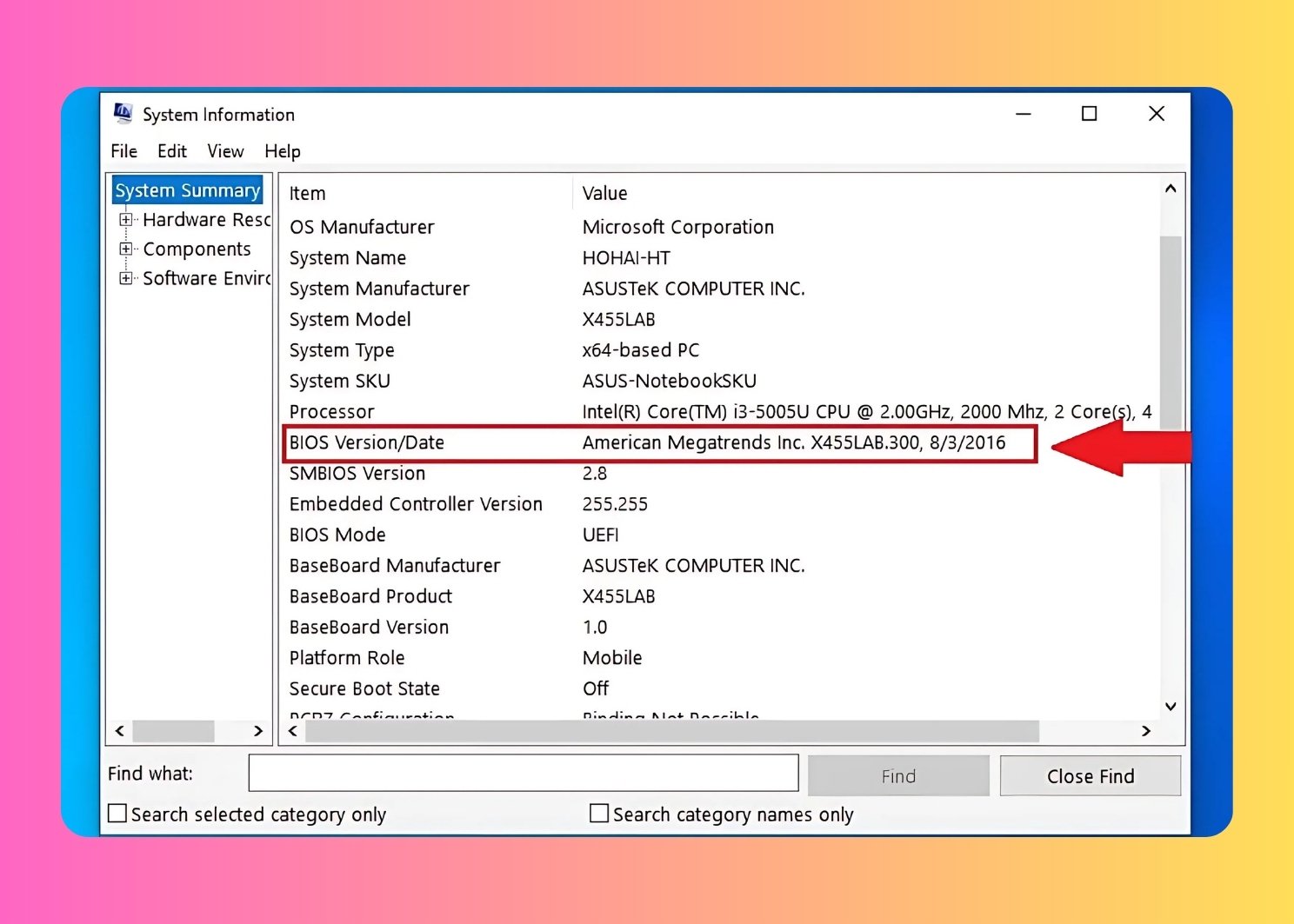 Bước 2: Trong cửa sổ “System Information”, tìm đến mục "BIOS Version/Date" để xem phiên bản và ngày phát hành của BIOS hiện tại.