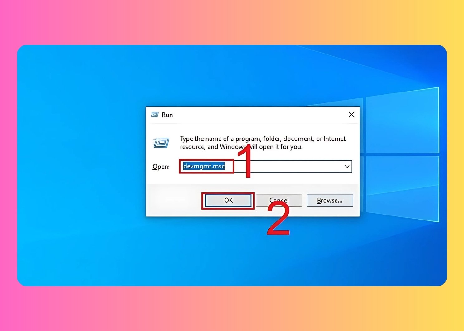 Tìm kiếm từ khóa “devmgmt.msc” và nhấn chọn “OK”