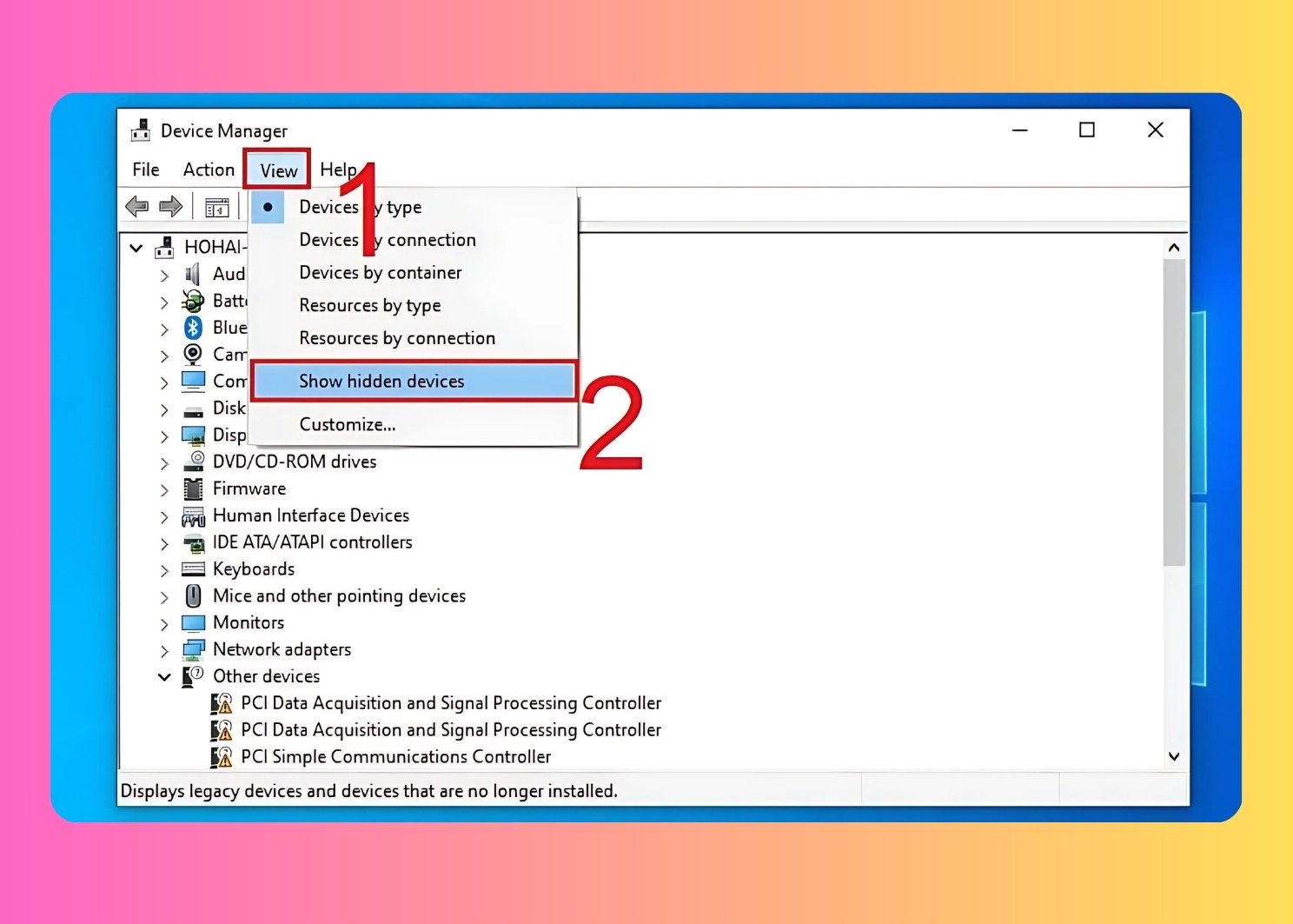Bước 2: Tiếp theo, tại thanh menu, chọn tab "View" và sau đó nhấp vào "Show hidden devices" để có thể xem các thiết bị ẩn trong danh sách.