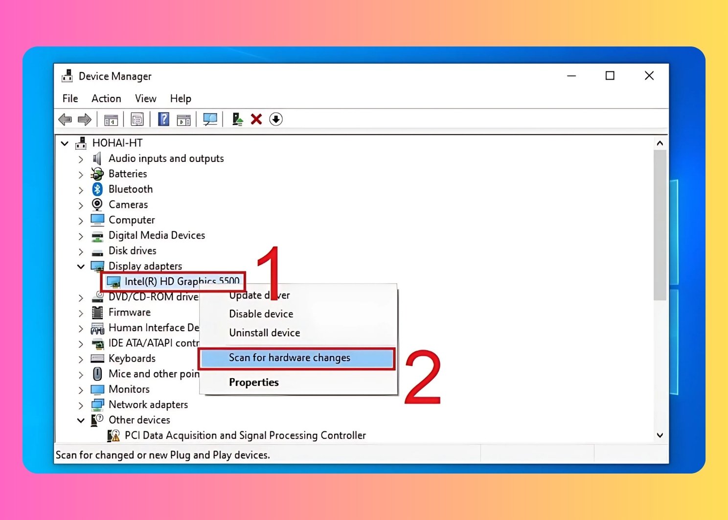 Bước 3: Tìm mục "Display adapters", sau đó nhấp chuột phải vào driver của thẻ đồ họa và chọn "Scan for hardware changes" để thực hiện quét và xác nhận các thay đổi phần cứng.