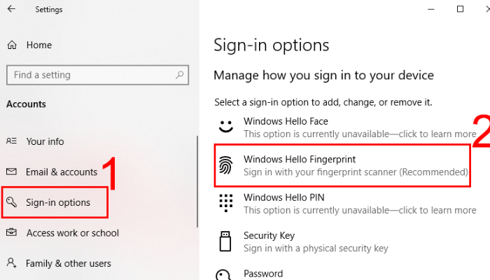 Bước 1: Vào Settings, chọn Accounts, tìm Sign-in options, chọn Windows Hello Fingerprint.