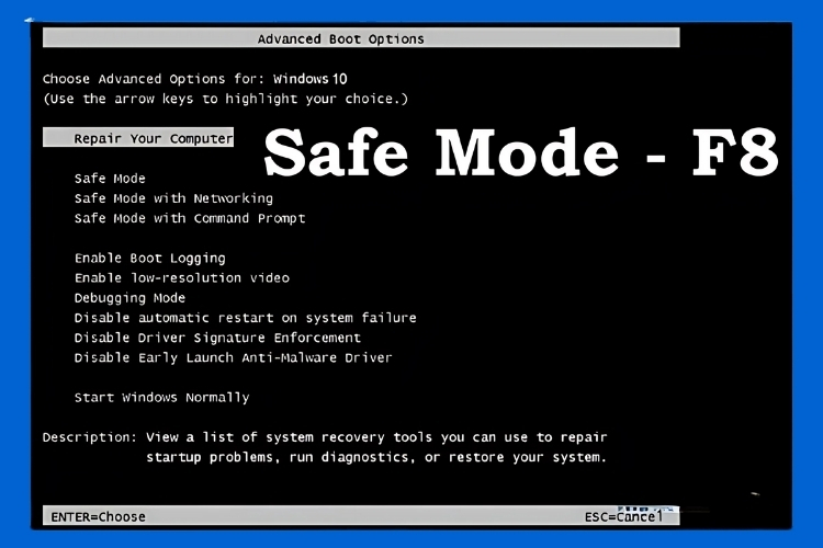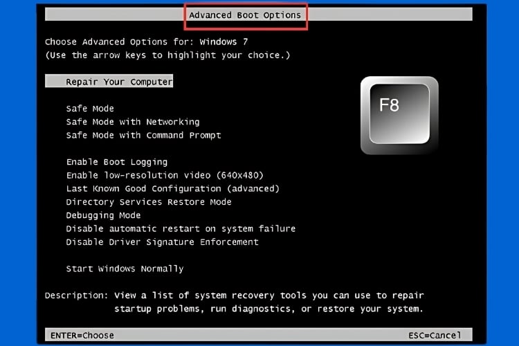 Bước 1: Khởi động lại laptop để vào chế độ Safe Mode bằng cách nhấn phím “F8” khi laptop đang khởi động.