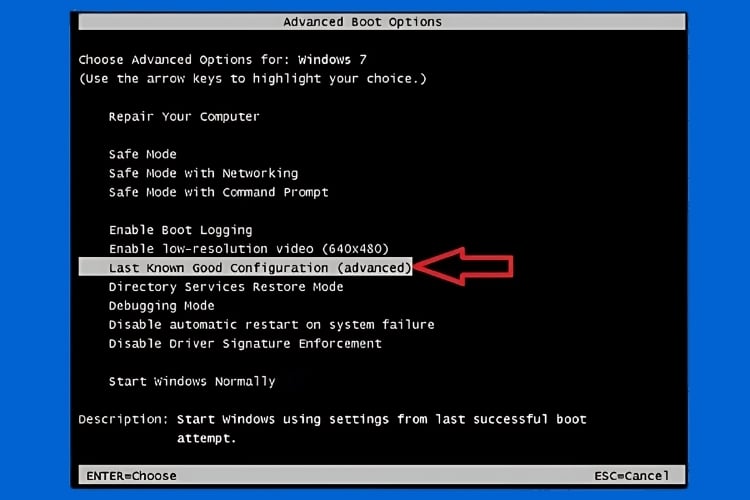 Bước 3: Ở menu “Advanced Boot Options”, sử dụng phím mũi tên để chọn “Last Known Good Configuration (advanced)”.