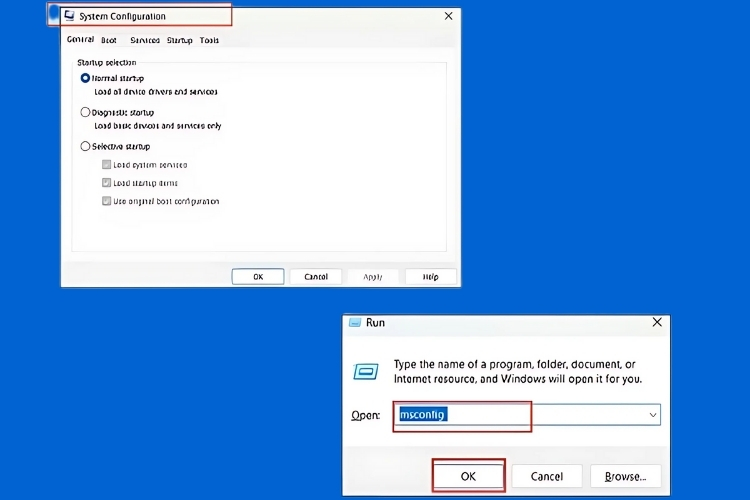 Bước 2: Nhấn tổ hợp phím “Windows + R” để mở ra hộp thoại “Run” rồi nhập lệnh “msconfig” và nhấn “Enter” để mở ra cửa sổ “System Configuration”.