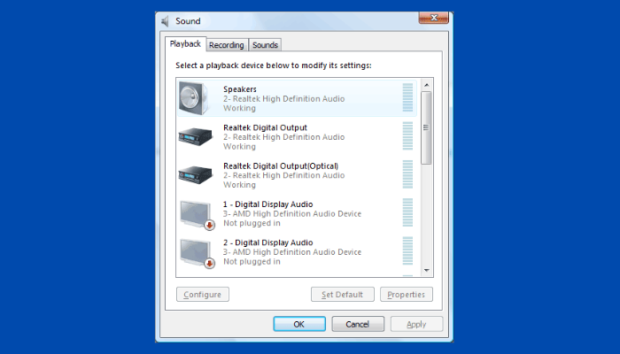 Bước 2: Nhấn chọn tab Playback, chọn thiết bị loa mặc định có dấu tích xanh, tìm Properties.