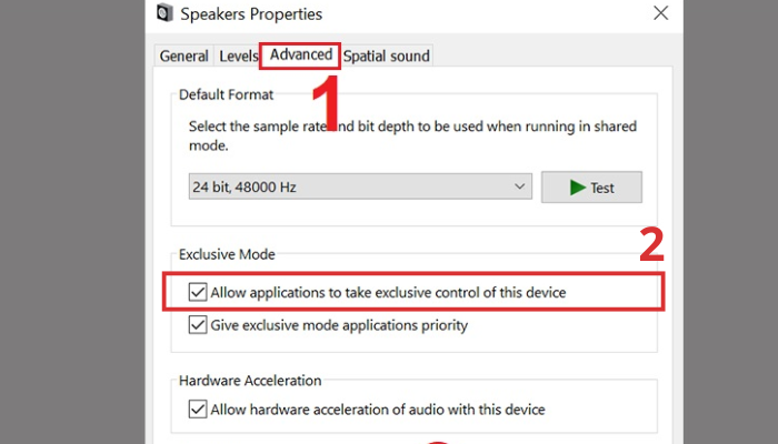 - Tại mục Advanced, bạn chọn ô Allow applications to take exclusive control of this device và ấn Apply.